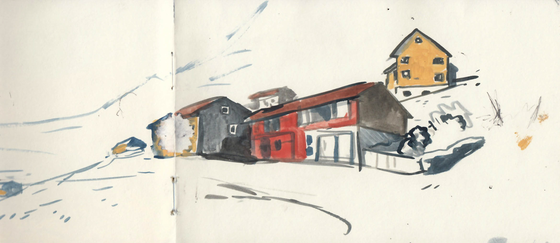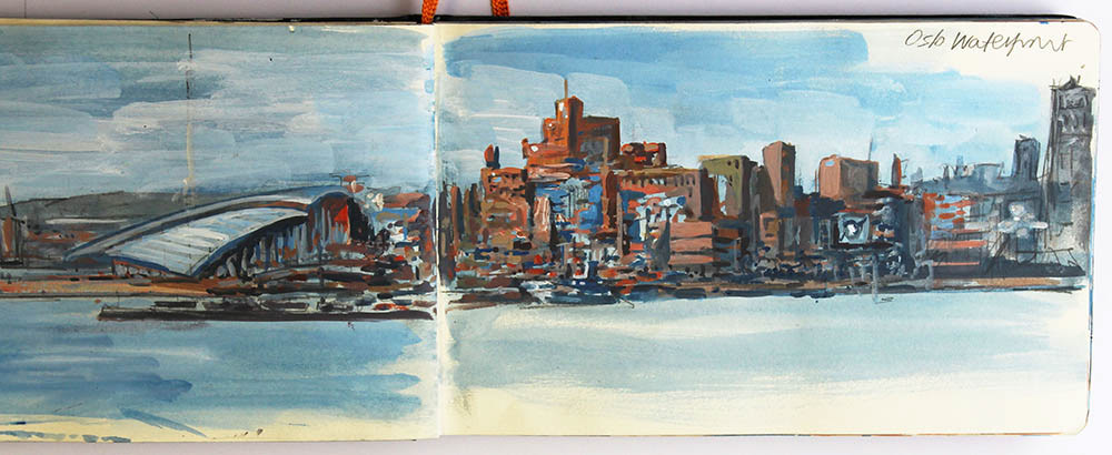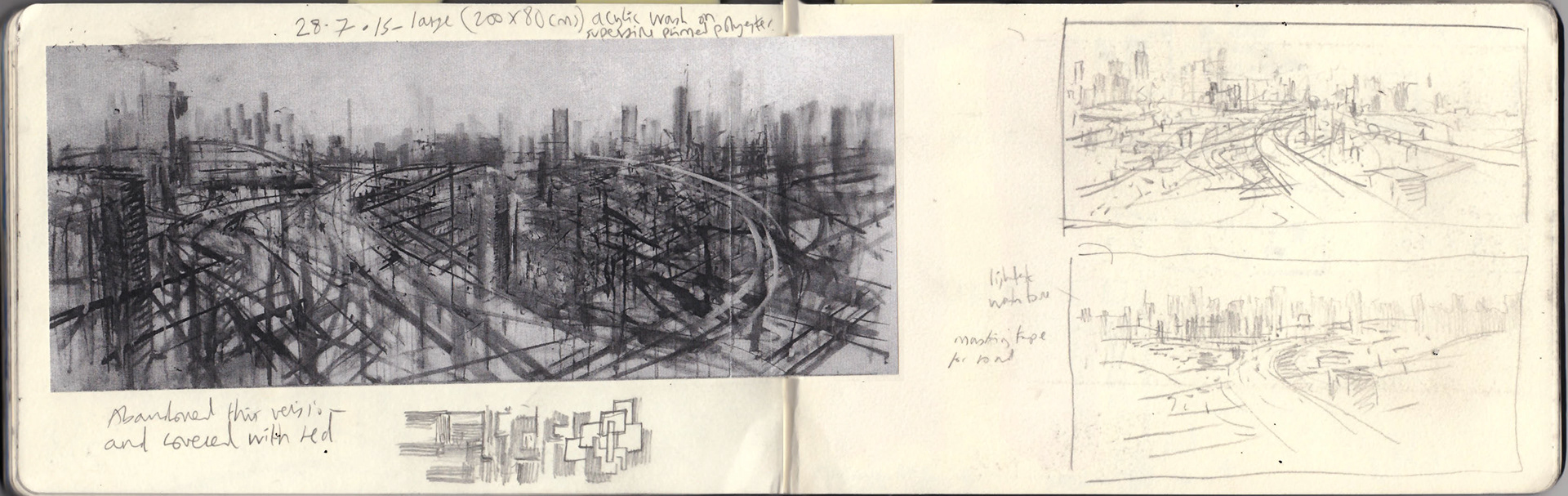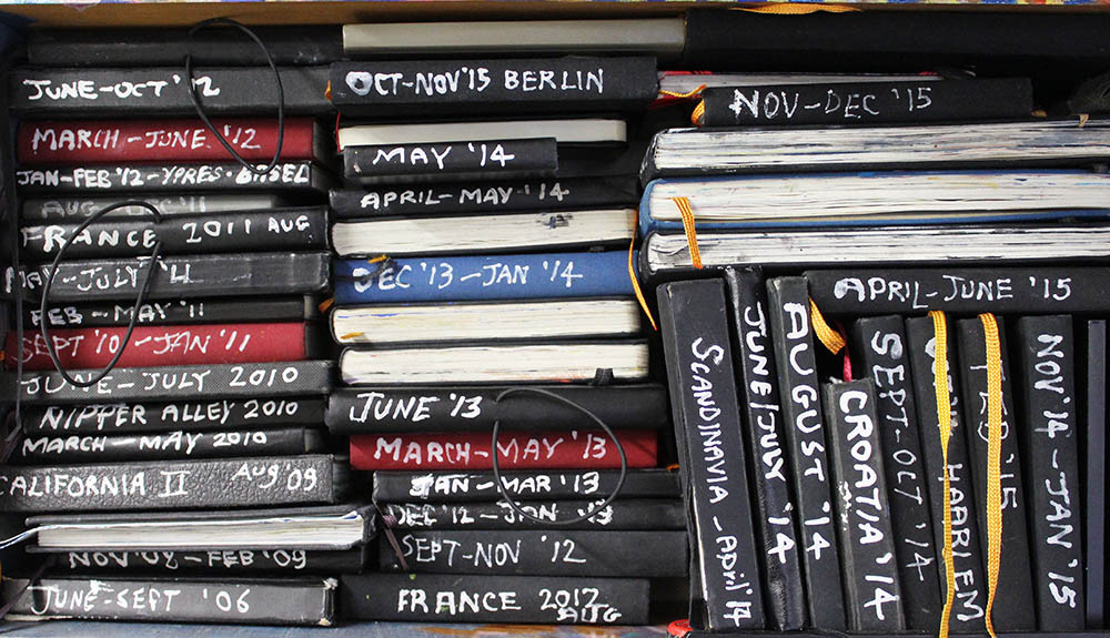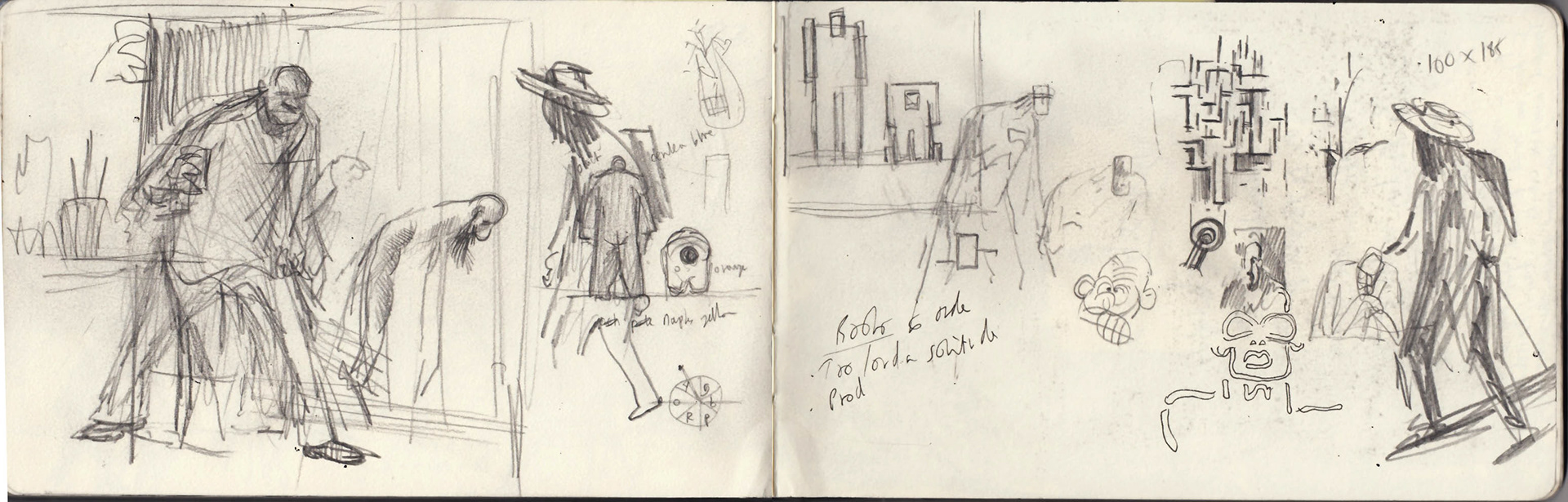 I go nowhere without a sketchbook and the sketchbook is where it all begins. They mark all the places I've been; they contain all the ideas I've had for paintings. Notes, scribbles, cartoons and caricatures, worked-up drawings, half-baked ideas, memos to self. Charcoal, pencil, ink, watercolour; conversations overheard, films I've seen, books read, family and friends I spend my time with- ghosts or fragments of them all end up in these pages.